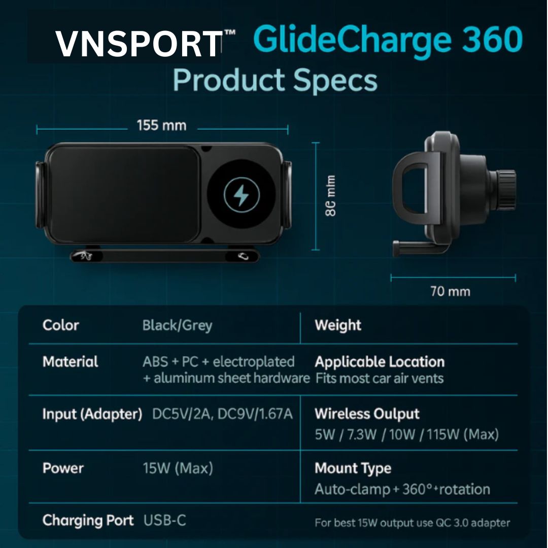 VNSPORT 360° Rotating 15W Wireless Car Fast Charger Mount