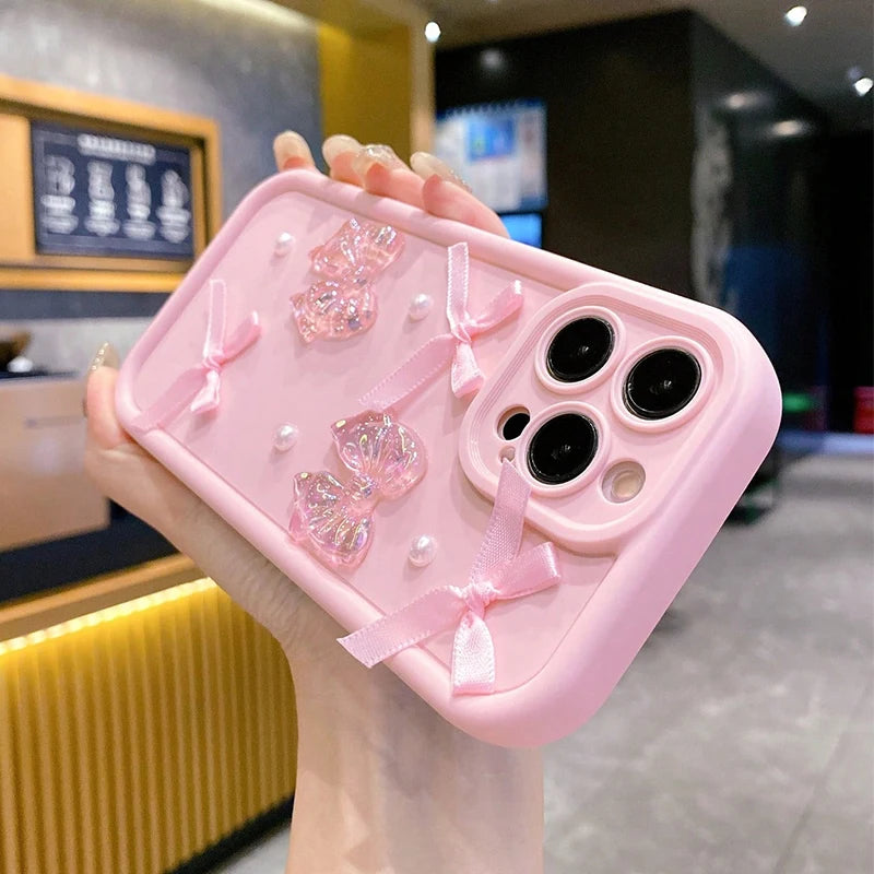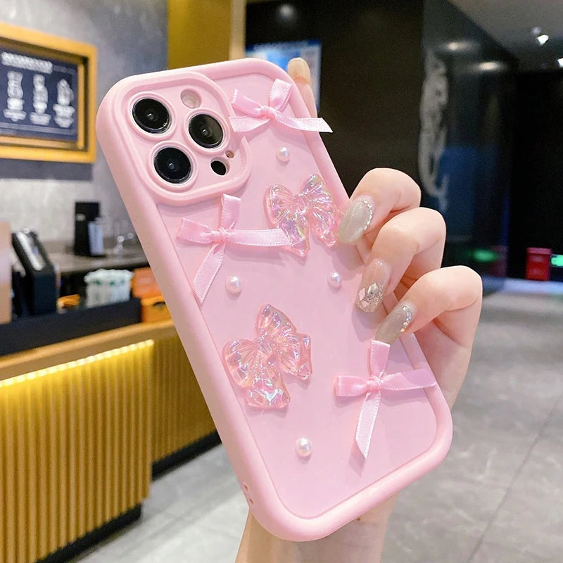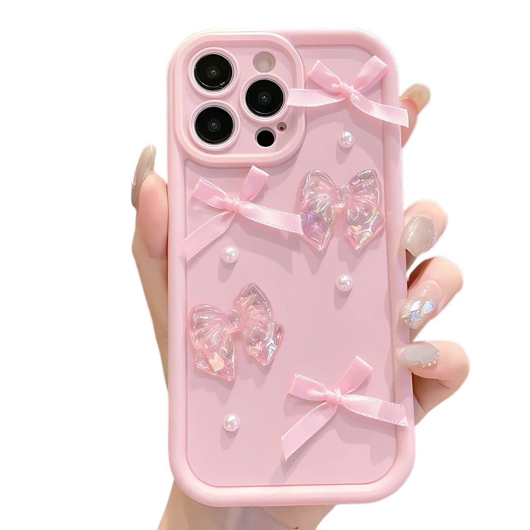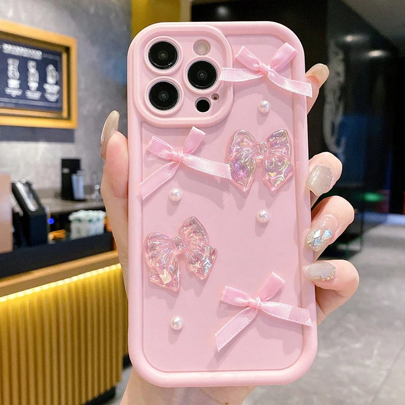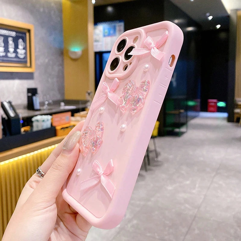 3D Bow Pearl Decorated Phone Case For iPhone 16 15 14 13 12 11 Pro Max 16E XS X XR 7 8 Plus SE2 Shockproof Silicone Soft Cover