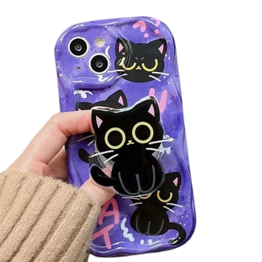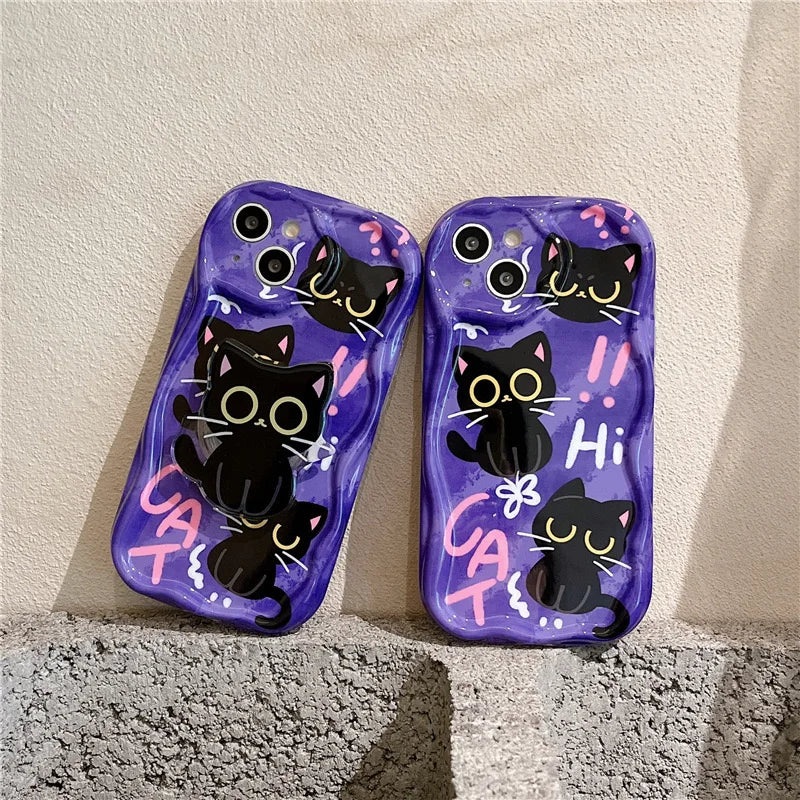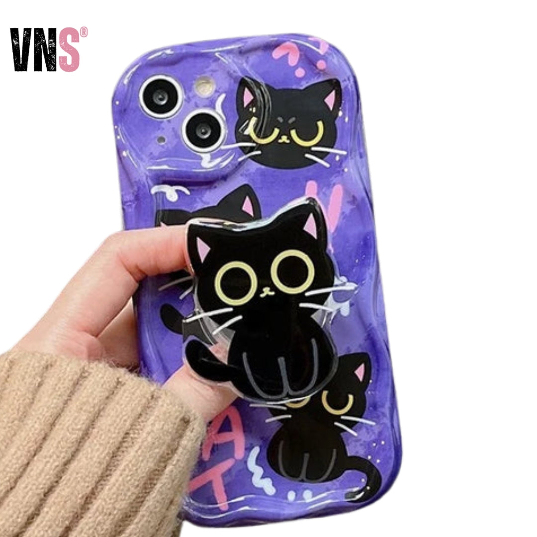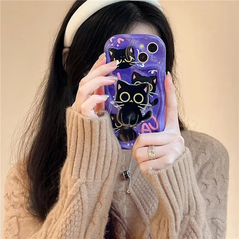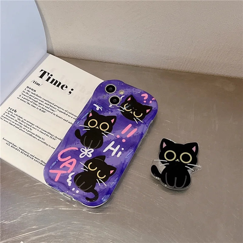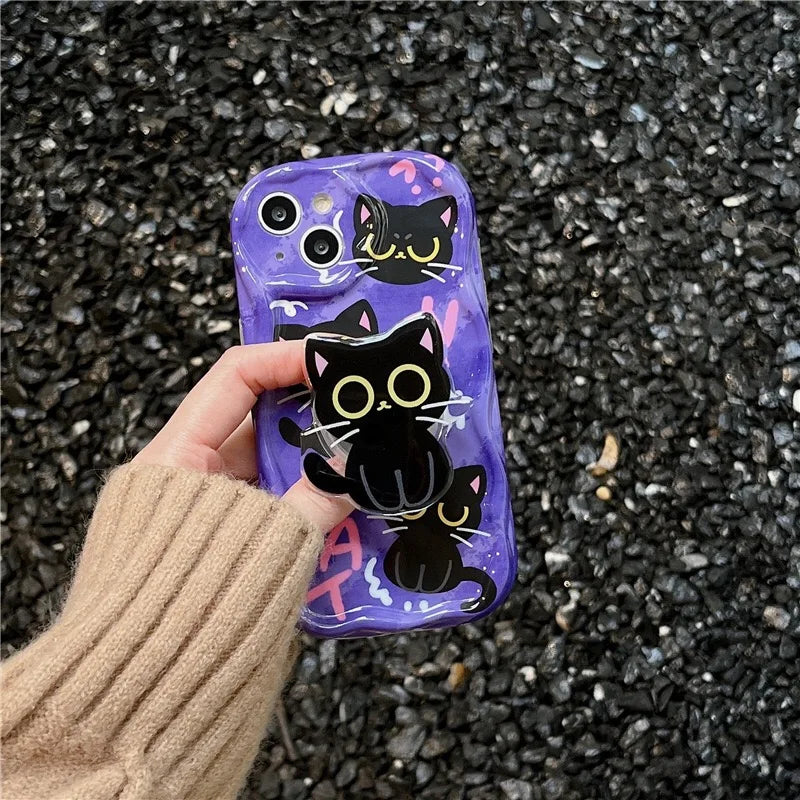 Cute Dark Cat Grip Tok Holder Wave TPU Soft Phone Case for Samsung Galaxy S23 Ultra S24 Plus S25 S22 S21 S20 FE A30S A51 A31 A50